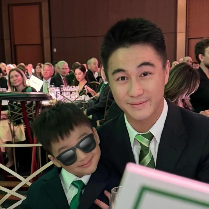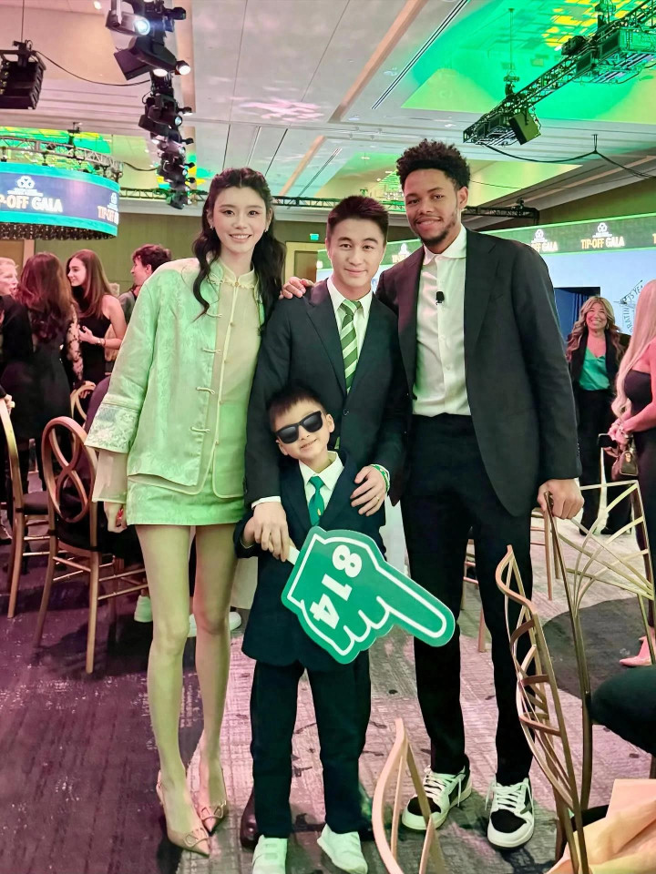 近日,何猷君带着老婆奚梦瑶和5岁的儿子何广燊一同参加了三叶草基金会慈善晚宴,一家三口还和凯尔特人球员西蒙斯拍了合影。