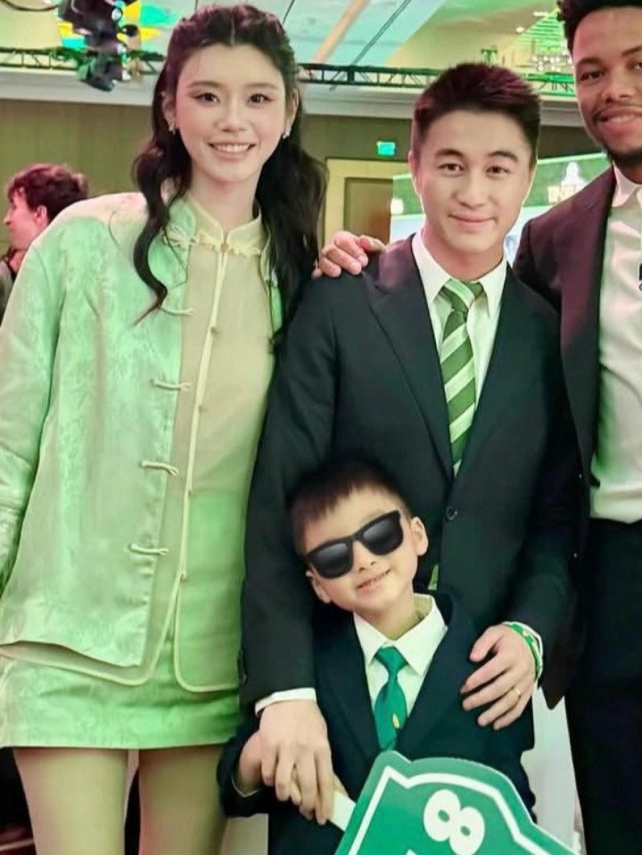 照片中,何猷君身穿黑色西装,搭配绿色领带,一身正装打扮帅气十足。奚梦瑶身穿新中式短裙,大秀修长美腿,温柔又显气质,颜值和身材都相当养眼,不愧是超模呀。儿子何广燊身穿黑色西装,同样搭配绿色领带,打扮就像小绅士一样帅气可爱。一家三口面带笑容,和球员西蒙斯合影,奚梦瑶还透露,西蒙斯还成为了儿子最喜欢的球员。